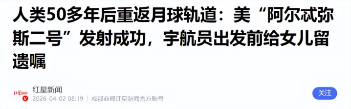 东谈主类50多年后重返月球轨谈:好意思“阿尔忒弥斯二号”放射收效,宇航员起程前给男儿留遗嘱——红星新闻